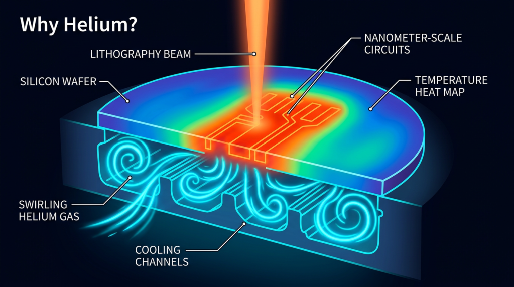 Helium is utilized throughout the chip-making process, from cooling silicon wafers during lithography to removing hazardous chemical residue following cleaning.